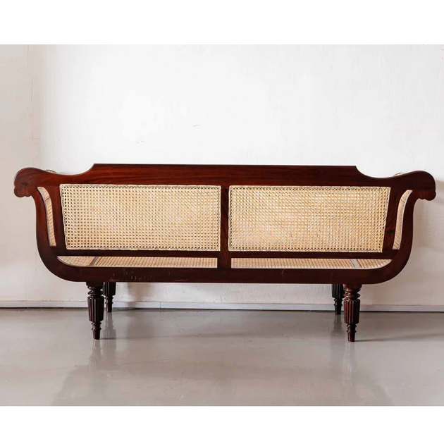 British Colonial Charm: Teak Wood & Rattan Webbed 3-Seater Sofa