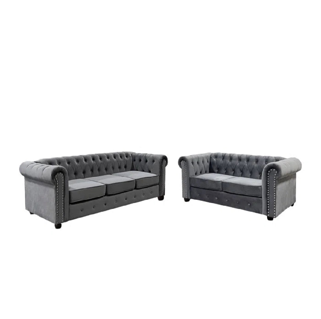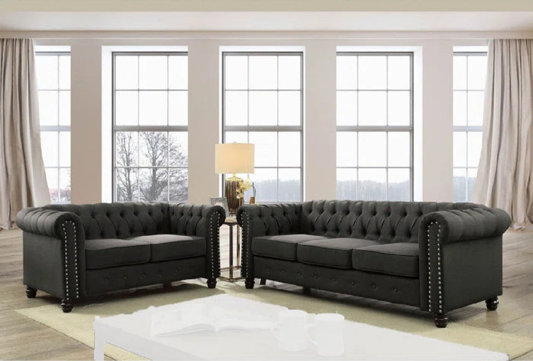 Traditional design details—rolled arms, deep diamond tufting, and decorative nailhead trim—add timeless character, while the neutral color options let you easily coordinate with your existing décor. Together, the sofa and loveseat comfortably seat up to five people, making this set perfect for gatherings or relaxed evenings at home.