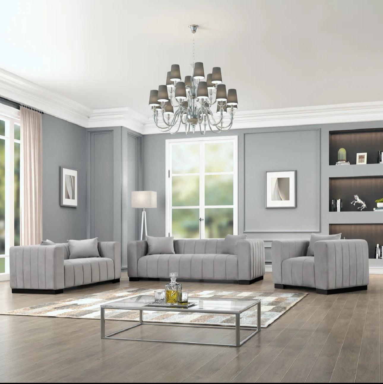 Elevate your living room with the Shine Wood Art Peggy 3-Piece Velvet Living Room Set, which includes a spacious three-seater sofa, a two-seater loveseat, and a stylish accent armchair—all upholstered in luxurious, soft velvet fabric. Designed with clean lines, plush foam padding, and a spring coil system, this set offers both superior comfort and reliable support. Whether placed in a wood-paneled library, a modern apartment, or a contemporary home, this versatile collection adds an instant touch of sophistication.