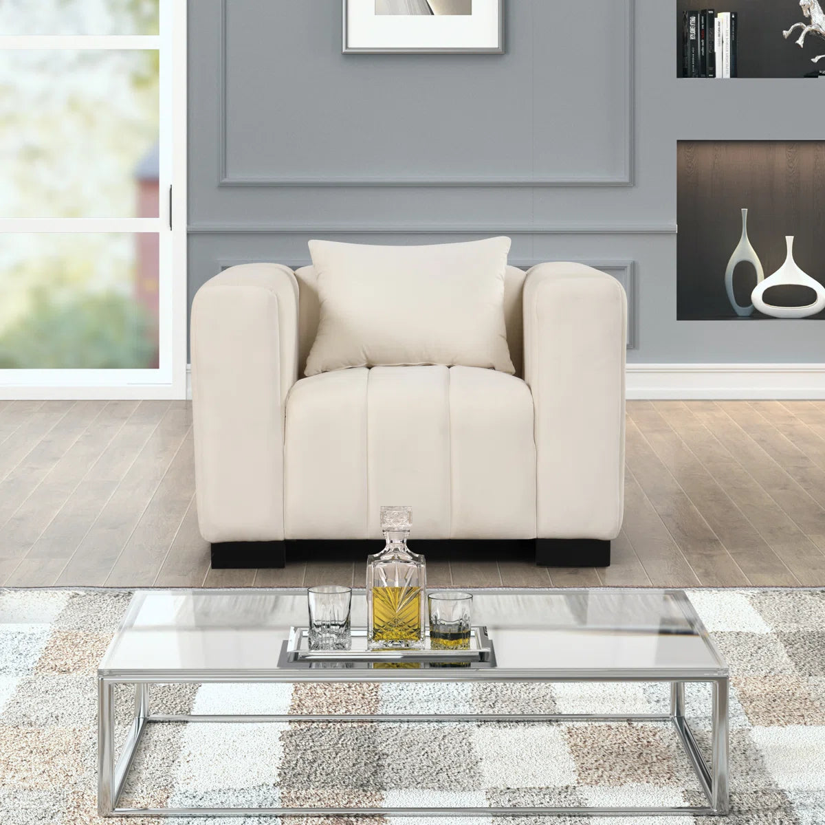 The straight-line accents along the inner back, sides, and outer arms highlight its modern aesthetic, while the solid wood legs with floor-scratch resistance ensure durability and practicality. This is more than furniture; it’s a stylish centrepiece for any space.