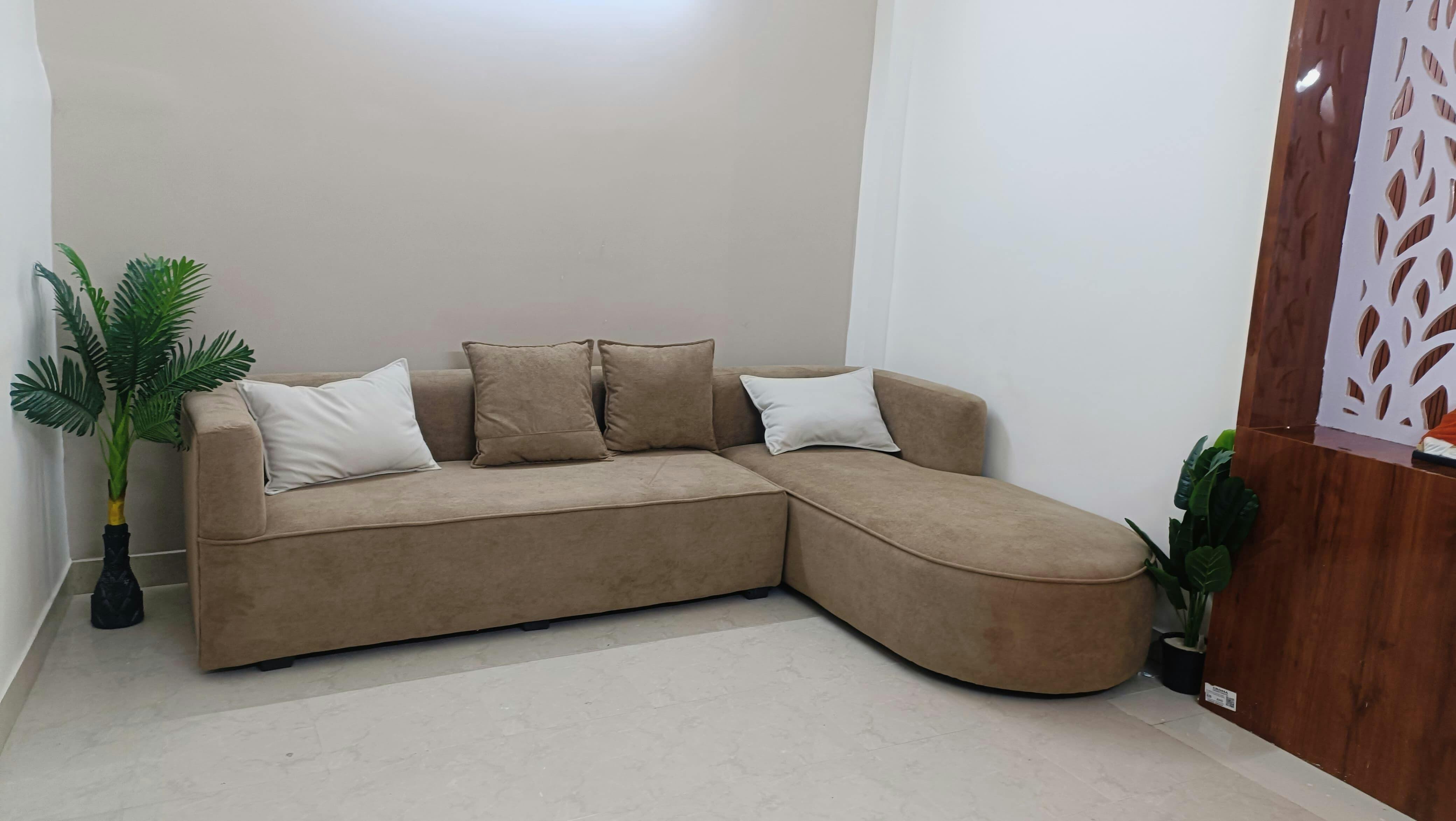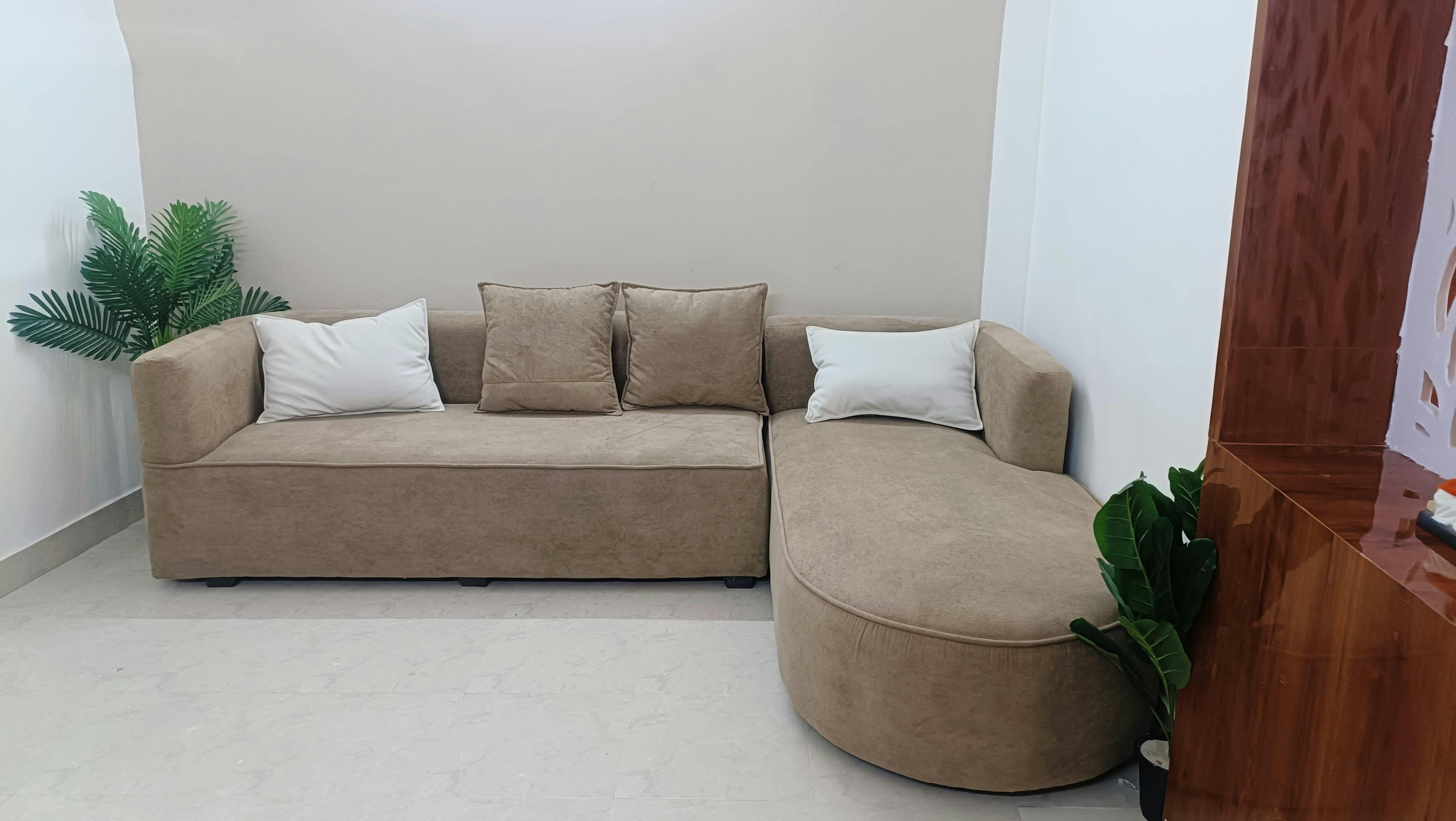 Elevate your living space with the Modern Curved Sectional Sofa by Shine Wood Art, crafted in a sumptuous brown suede finish that exudes both elegance and comfort. This L-shaped designer sofa offers ample seating with plush cushions and a low-profile silhouette, making it a perfect centerpiece for contemporary homes.