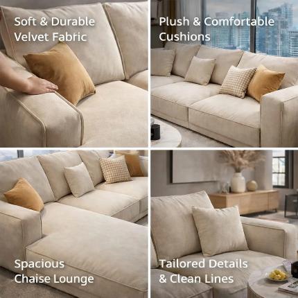 Upgrade your home with this luxury modern L-shape sectional sofa, thoughtfully designed to deliver both style and exceptional comfort. Upholstered in soft and durable velvet fabric, this sofa creates a warm, inviting atmosphere while adding a sophisticated touch to your living room.