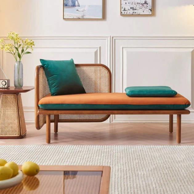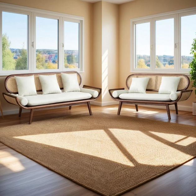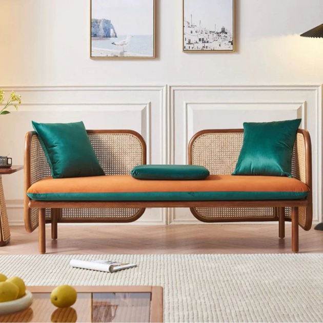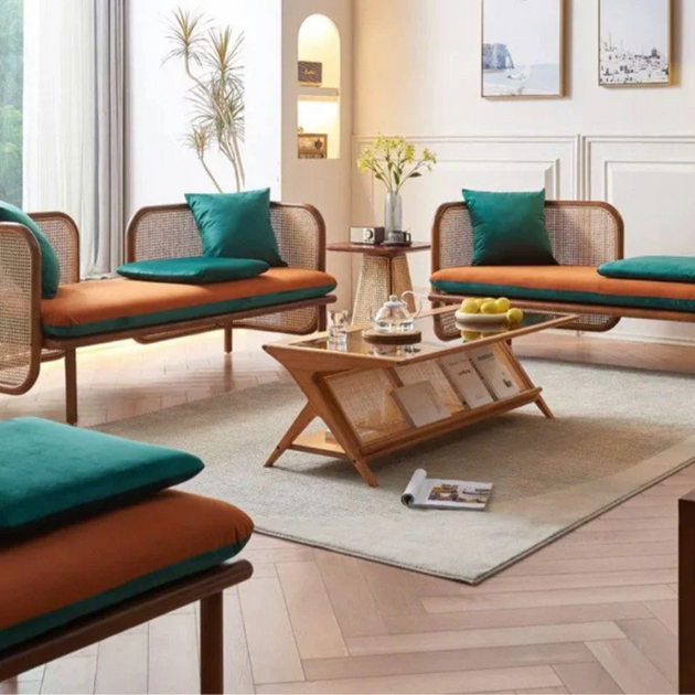 Solid Teak Wood & Rattan Webbed Sofa Set with Velvet Upholstery – Natural Elegance, Plush Comfort