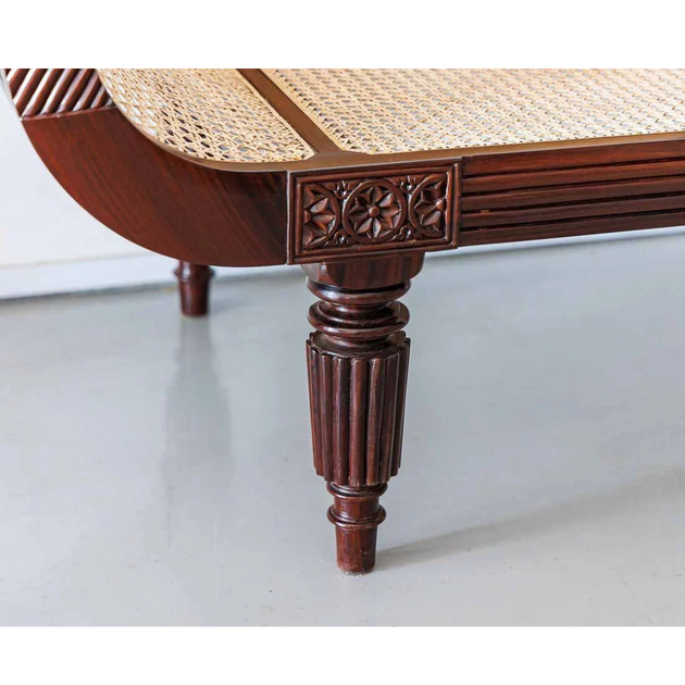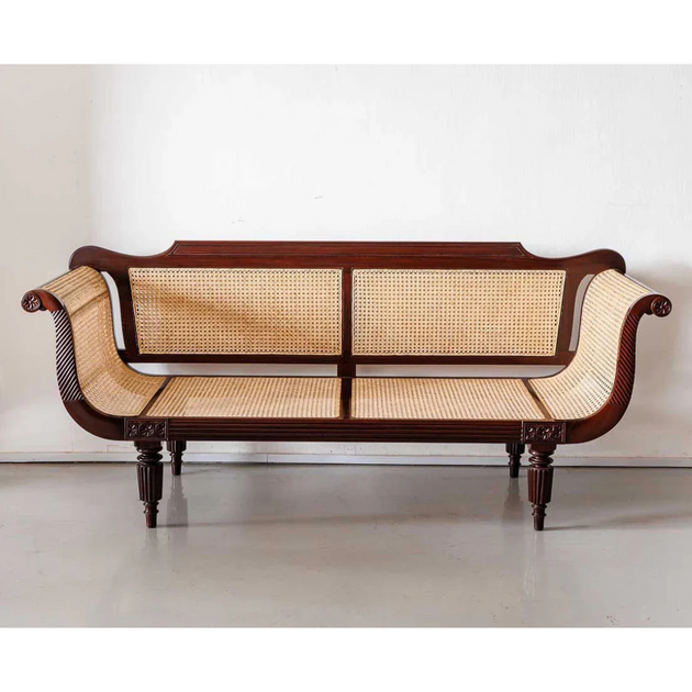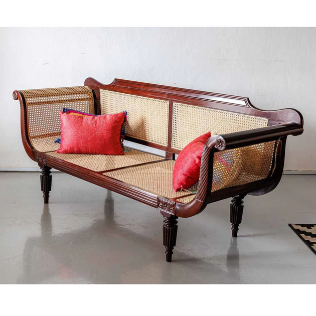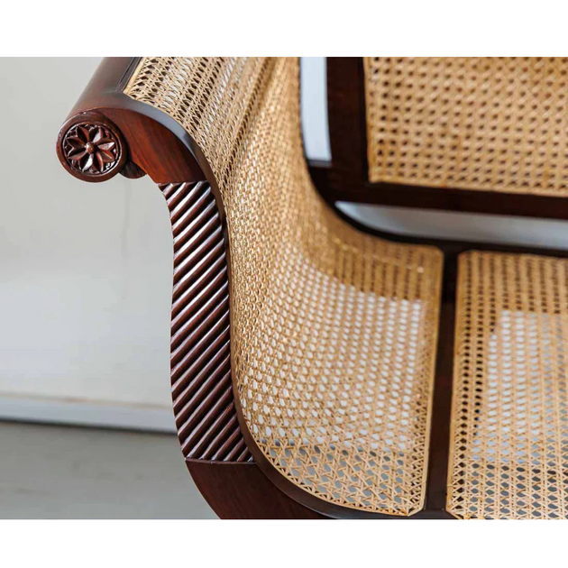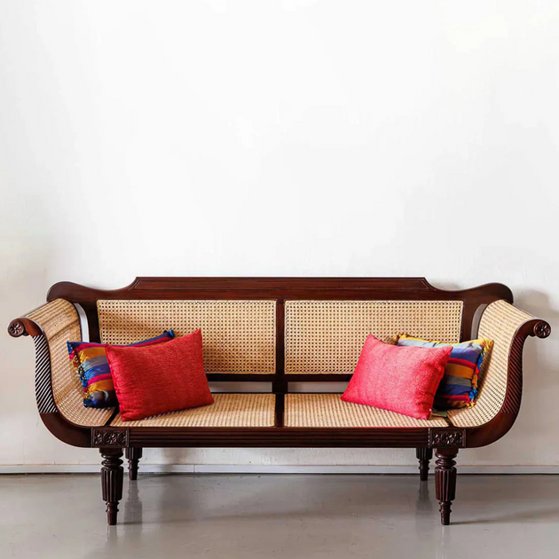 British Colonial Charm: Teak Wood & Rattan Webbed 3-Seater Sofa